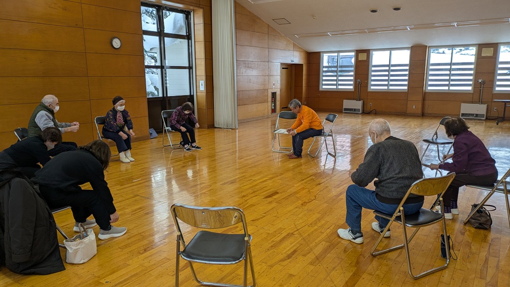 測定が終わると、いつものように「いきいき運動推進員」さんによるご指導で、1時間弱体を動かしました。今日は奥さんが風邪ひき、冬期間は来られないなどの理由で少なめのニコニコ広場です。