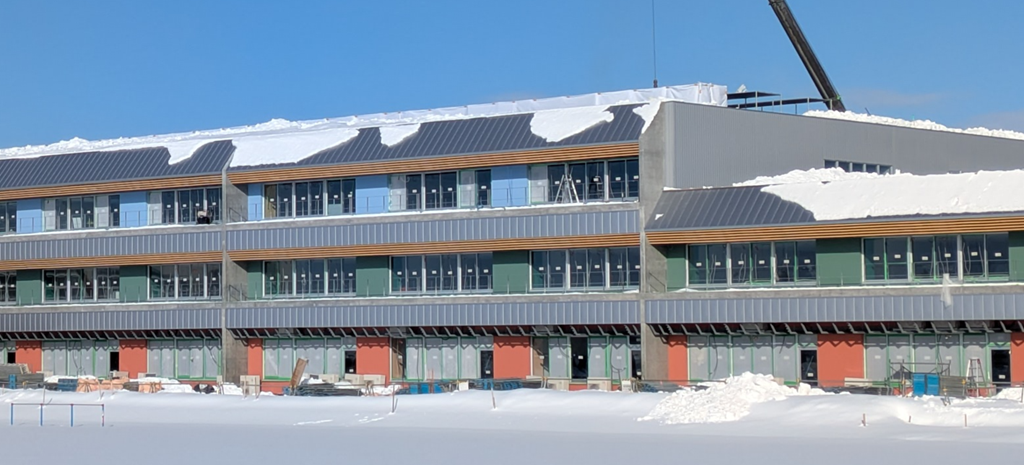 外出の途中で建設中の「砂川学園」の側を通ると工事用のフェンスが取れている南側(グランド側)の校舎が見えました。