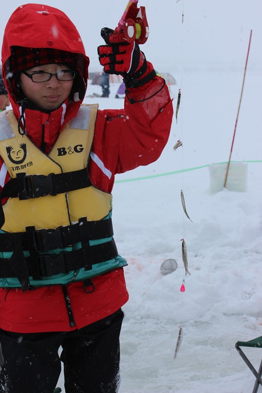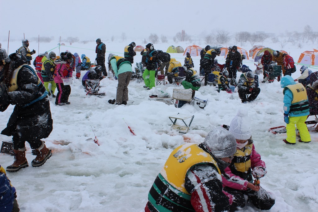 本日朝のオアシスパークはけっこうな吹雪状態でしたが、教育委員会が主催する「ジャリン子冬体験ワカサギつり」が行われました。