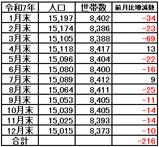 下の表は私が作成した令和7年1月~12月までの人口推移です。