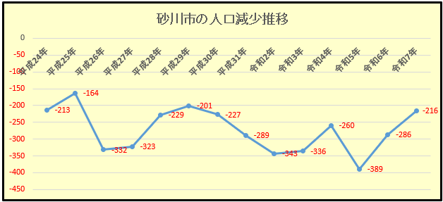 今、私の所に令和7年の人口動態の詳しいデータはありません。その内、総務省の人口動態のデータが出ると思いますが、少子高齢化が著しい砂川市では自然動態については▼200人はしばらく続いてしまうのではないかと思います。