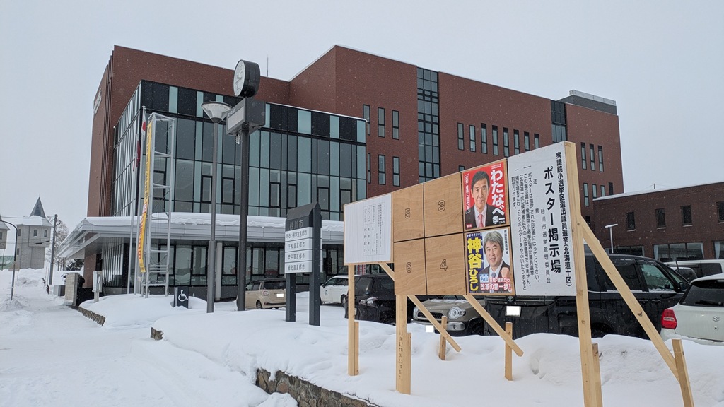 前回の参院選の時は86ヵ所。今回の衆院選は突然の真冬の解散だったので、市内には20ヵ所の掲示看板を立てたそうです。