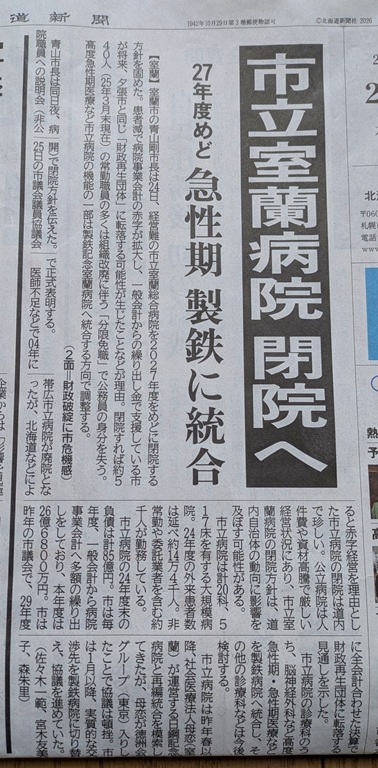 以前からいろいろな事が取り上げられていた市立室蘭総合病院が最悪の結果になりそうです。2027年をめどに「閉院」ですって!