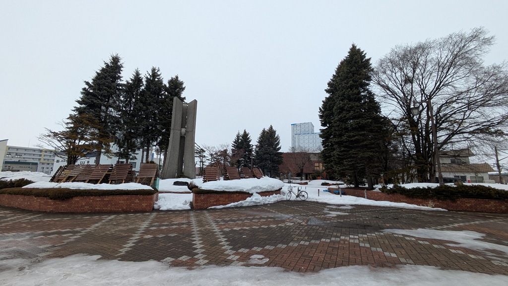 奥にシートが掛かっている砂川パークホテルは㈱シロが改築中。また、市政執行方針には『整備から37年が経過した駅前広場につきましては、歩行者や送迎車の利便性向上を図るため、隣接地で実施する民間事業に合わせて、一部再整備を実施してまいります。』と書かれています。