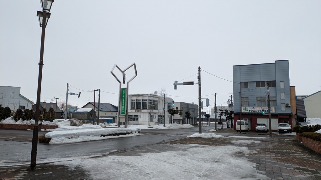 駅から国道12号線方面を見ています。縦の道路を国道まで行けば、まちなか交流施設「すないる」があるのですが、ここからでは姿が見えないのが残念です。