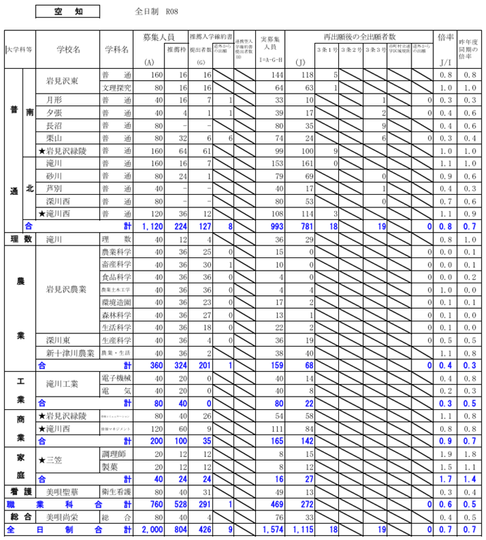 この近辺の高校で定員を超えているのは、滝川高校の普通科で8名、滝川西高(市立)の普通科が6名、新十津川農業高校で2名がオーバーしています。挑戦の春ですね。