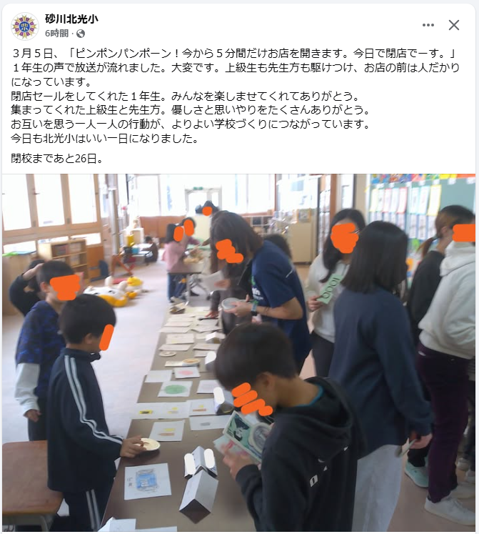 最近では学校と保護者との連絡はデジタル化して私たち一般人には学校の情報は伝わってきません。そんな中、北光小学校のFBはお友達になっているので見ています。