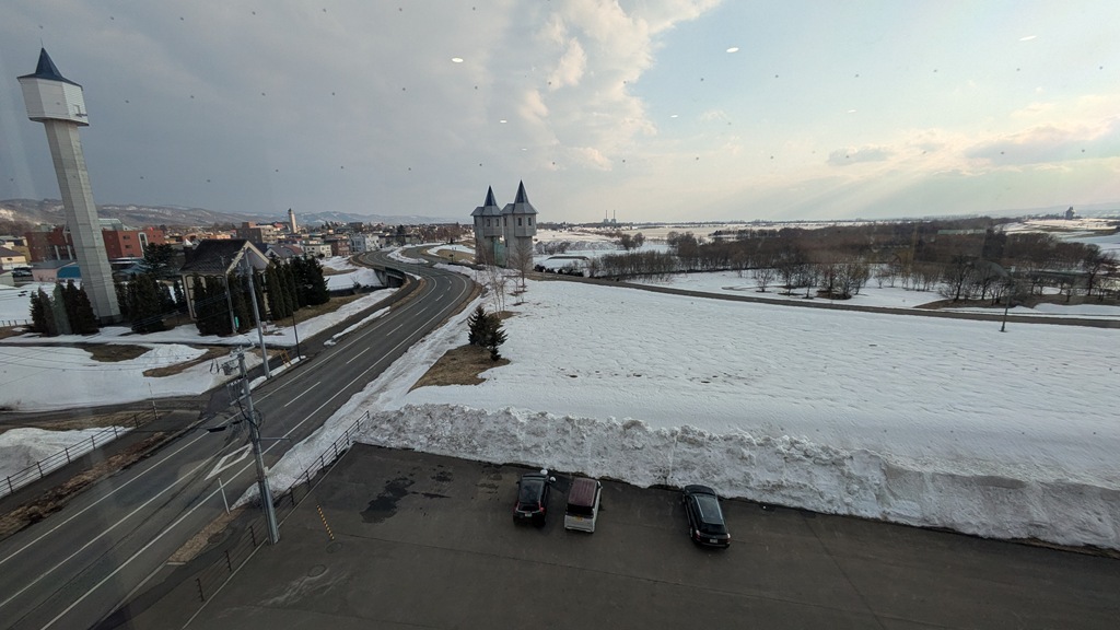 帰宅前に市役所4階展望ラウンジから見た今日の砂川。アスファルトは日頃から除雪しているので、ほとんど出ていますが、まだまだ雪が残っています。