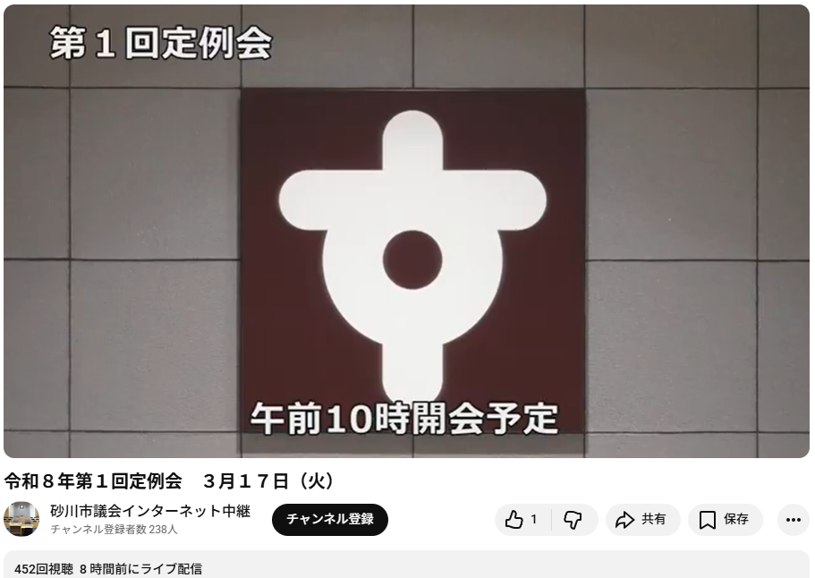 上はYouTubeに残っている編集前のインターネット中継録画の画像です。 「令和8年第1回定例会 3月17日(火)」にリンクしますのでご覧ください。(編集後の録画ができましたのでリンクを解除しました)