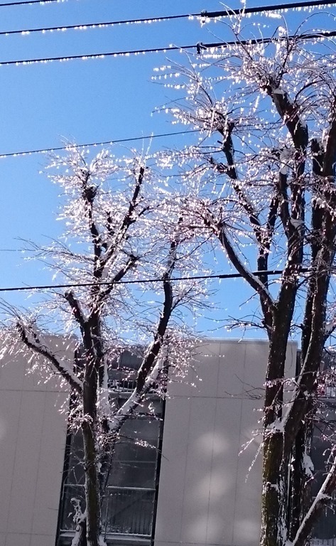 本日の朝、議会改革特別委員会に出席のため市役所前に車を停めてフッと市立病院の立体駐車場の方を見ると、昨日の雨が今朝の寒さで一気に凍ったのでしょう。木に付いた氷の華が朝日を浴びてキラッキラ!輝いていました。