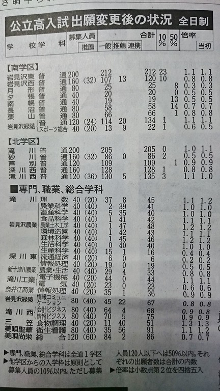 上の写真は15日に道教委で公表された「公立高校入試出願変更後の状況」ですが、「道教委の高等教育課のHPの出願変更」に全道学区の状況が掲載されています。