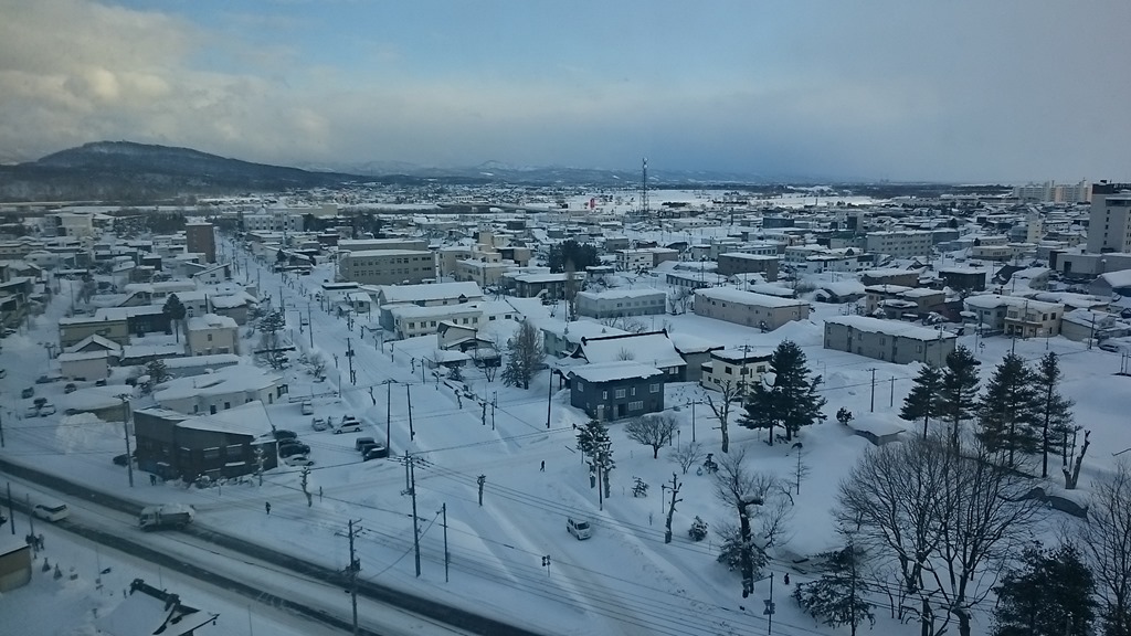 上の写真は議場がある滝川市役所10階の窓から砂川方面を見たところです。国道の車線以外はどこを向いても真っ白です。