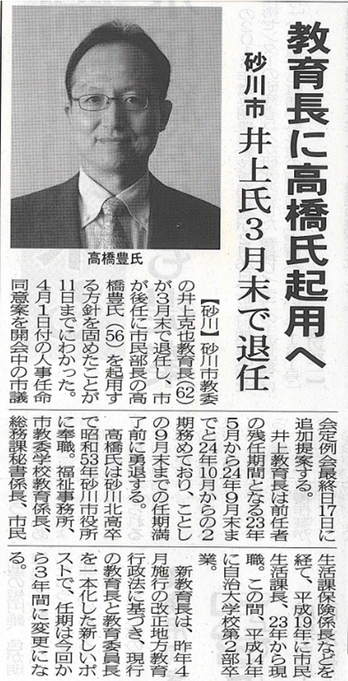 さて、議会終了後しばらくして、市役所職員の人事が始まりますが、今年は管理職で大幅な異動がありそうです。それは、17日に高橋豊教育長が議会で同意されれば、市民部長の席が空きます。