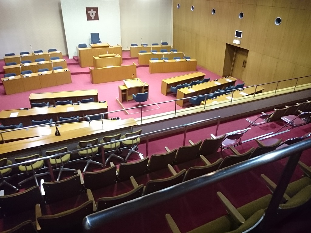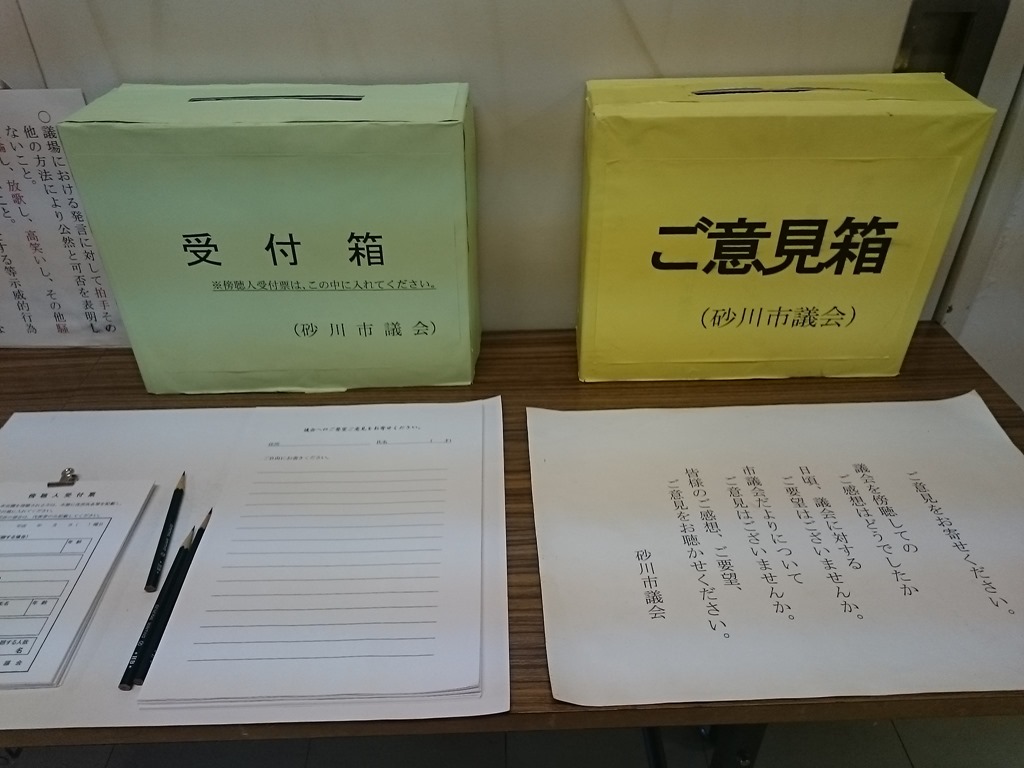今議会は傍聴される皆さんが増えて来ていて嬉しいのですが、どうぞ、皆さんも傍聴に来てください。上の写真は市役所3階の傍聴室の前の申込用紙ですが、住所、氏名を書いて、扉を開ければ右の写真のような席が並んでいます。