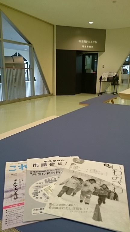 左の写真は「こどもの広場」の外側のベンチで休んでいると、岩見沢市の広報とか「市議会だより」が置いてありました。ふと、横を見ると㈱振興いわみざわの看板が。