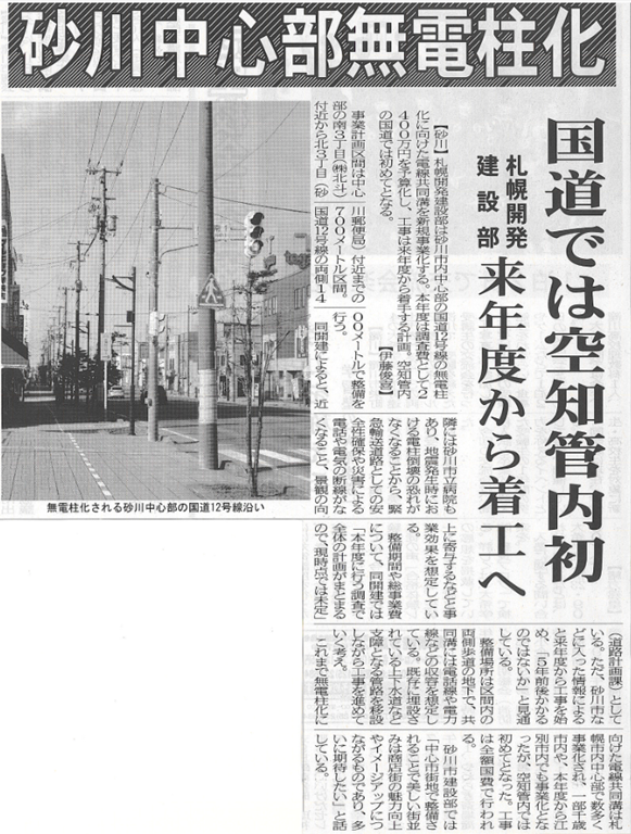 上の写真は9日付けのプレス空知砂川面に掲載されたものです。砂川市の中心部が無電柱化になるという記事ですが、多分、社会経済委員会でも報告されていなかったと思います。