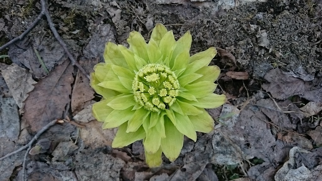 上の右の写真は近くに生えていたフキノトウです。見事な形についカメラを向けました。何となく議員バッジを連想させる形です。