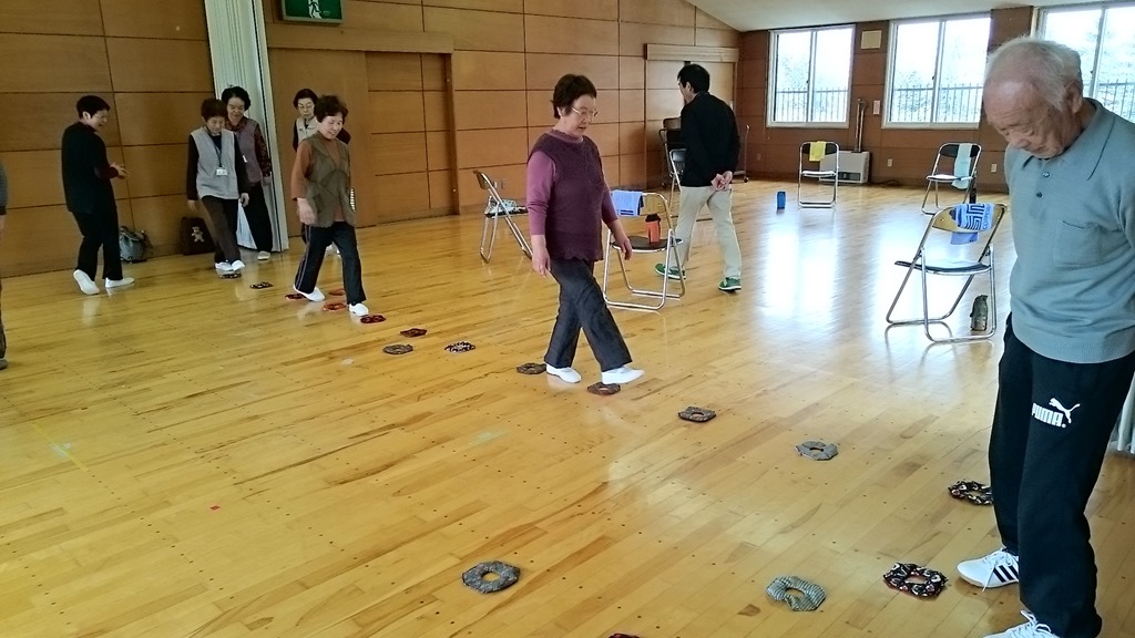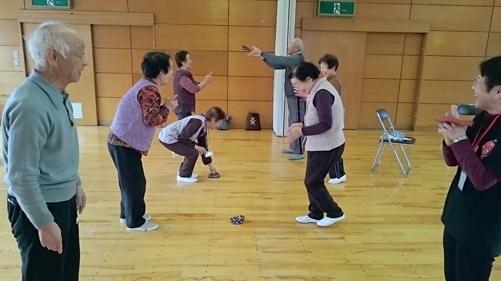 今回は、運動後に推進員さん手づくりの物を使ってゲーム感覚の運動も行われました。実は、いきいき運動推進員の皆さんも高齢化が進んでいるようです。今後は、市内を北、南、中央と分けて、それぞれ住居の近くの運動サロンを担当するようになったとのことです。