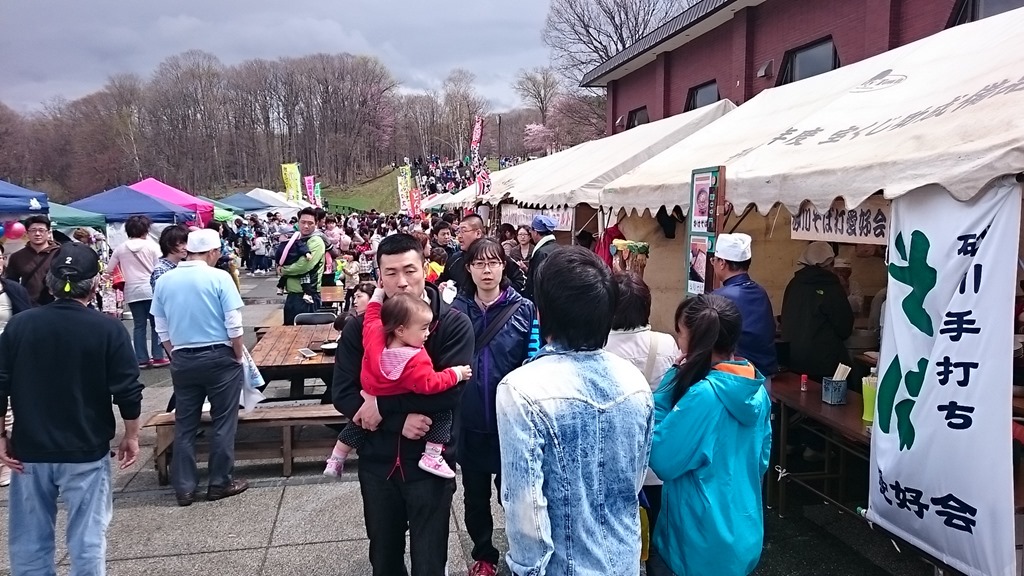 本日は「子どもの日」。砂川市内にある「道立子どもの国」ではフェスティバルが行われましたが、朝から生憎の天気でした。雨は降るし、冷たい風は強いし。上の写真は砂川手打ちそば愛好会の出店の午前11時過ぎの様子です。