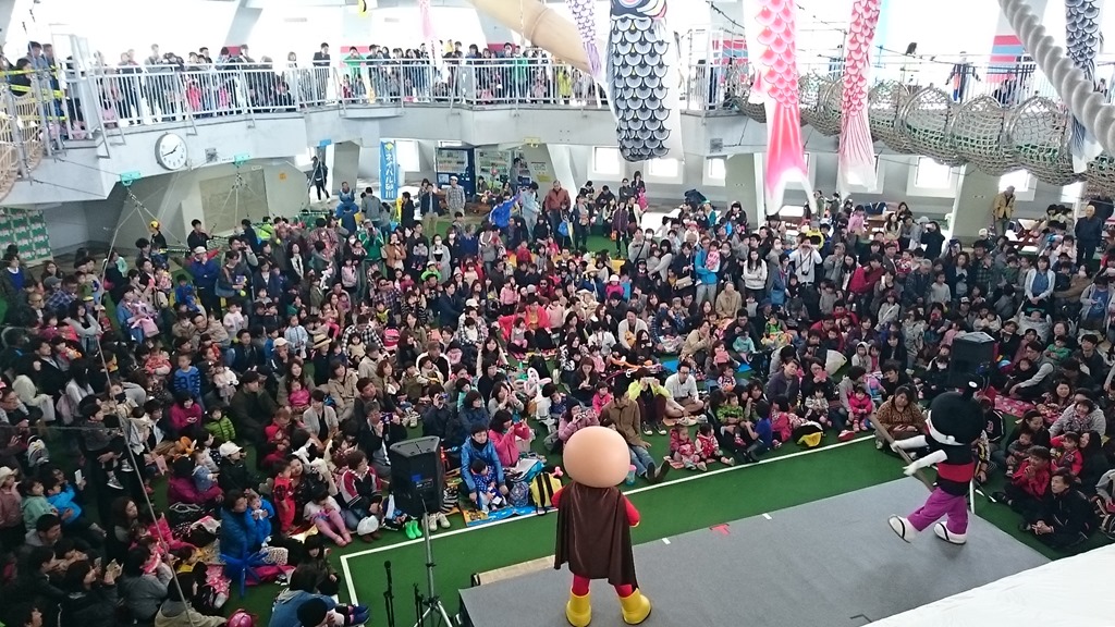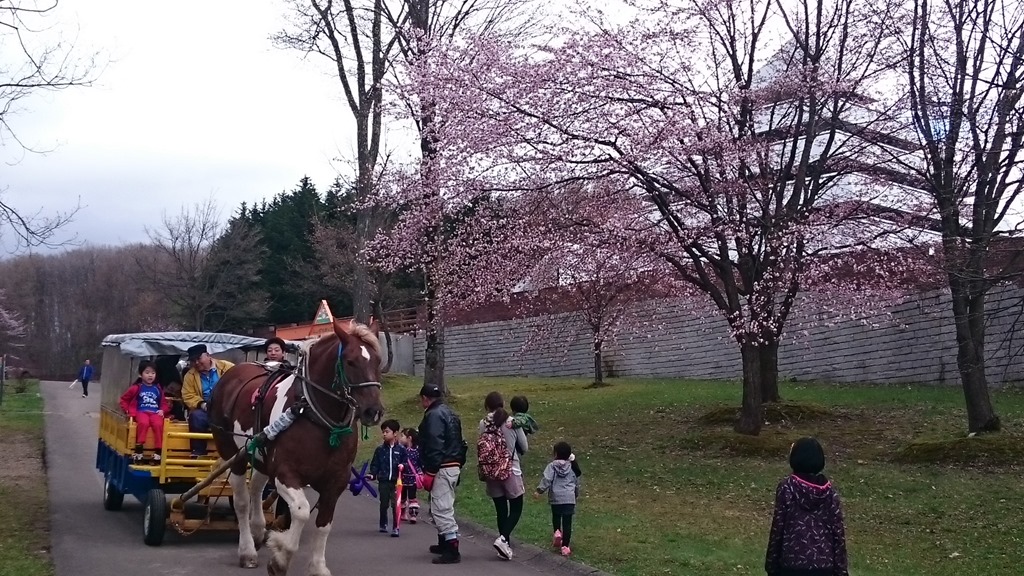 それでも、満開の桜の側を遊覧馬車が通ります。天気が悪くピラミッドの中で行われた「アンパンマンショー」に大喜びの子ども達を見て、こちらも楽しくなりました。楽しい思い出、できたかな?