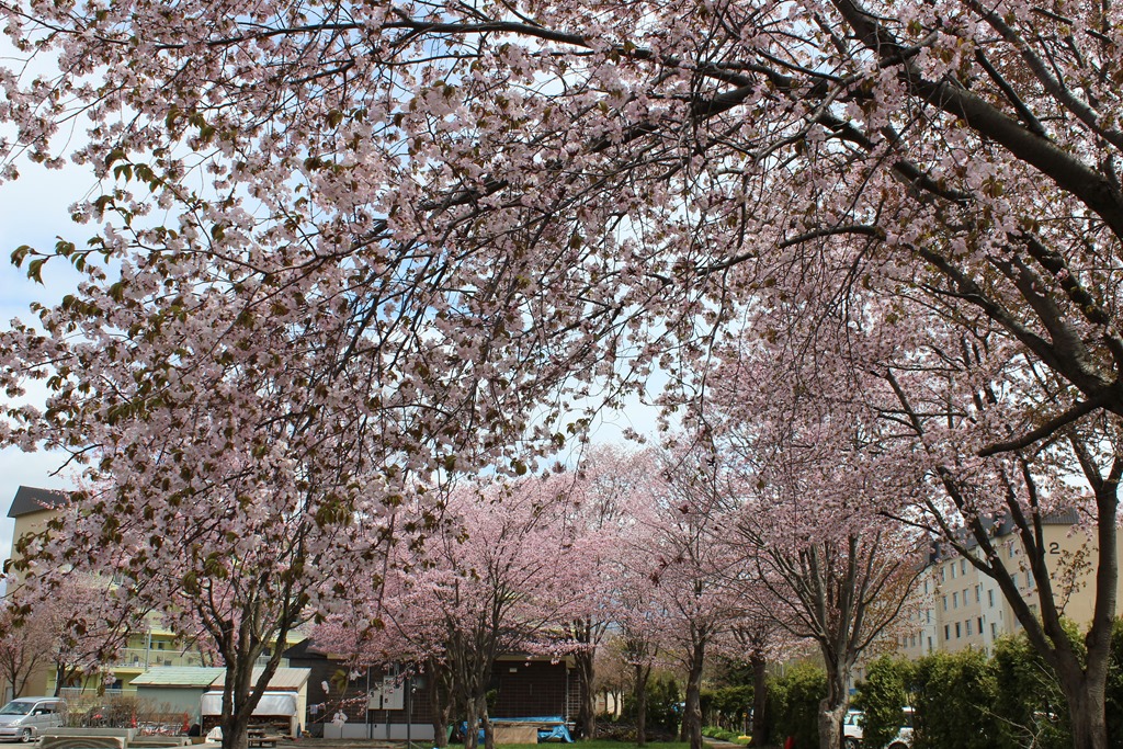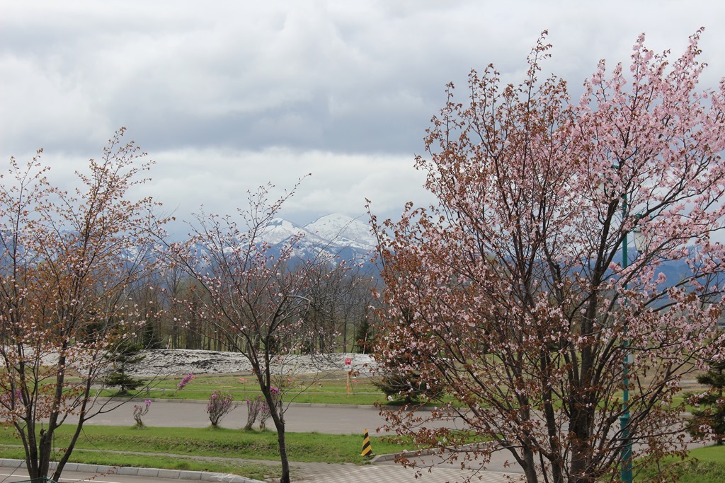 そして、右の写真はオアシスパークです。本当は青空に白く輝くピンネシリとピンクの桜をイメージしたのですが、昨日は残念ながらご覧のような花曇り。次の機会を待ちましょう。
