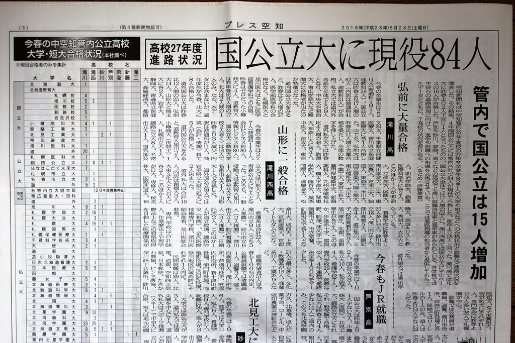 5月28日号のプレス空知に「今春の中空知管内公立高校卒業生の進路状況」が掲載されていました。上の写真はその一部です。