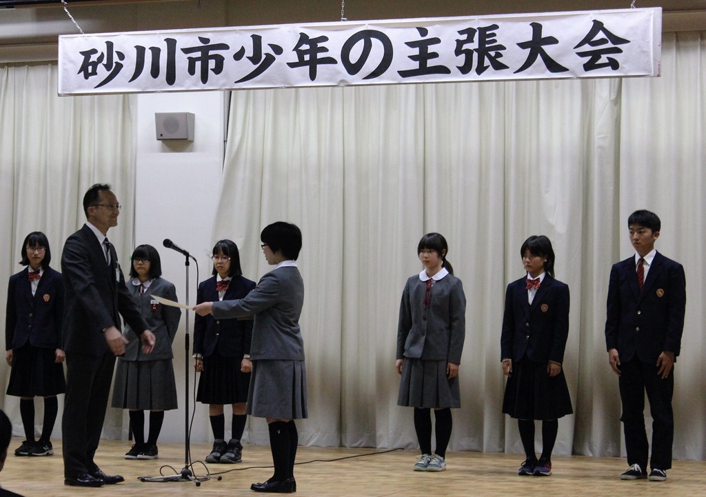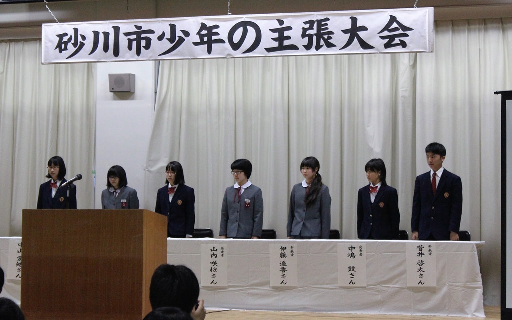 主張は砂川中4名、石山中3名の1年から3年生で行われました。(写真中)みんな立派に約5分の持ち時間を元気いっぱいに主張していました。