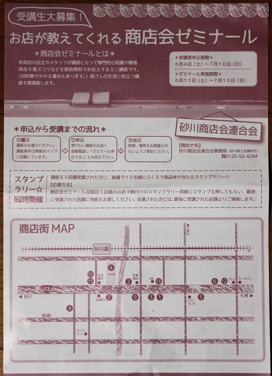 主催は砂川商店会連合会で講座を3店舗受講されると、抽選で10名にフクロウ商品券が当たるスタンプラリーが同時開催される特典付き。