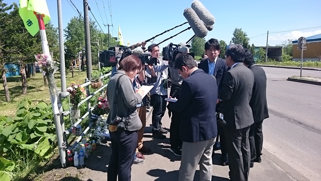 集会開催前の午前9時30分に市長、議員が参加して事故現場で黙とうと献花を行いました。上の写真は多くの取材陣のインタビューに答えている市長ですが、今日も朝から多くの新聞社やテレビ局が取材に来ていました。心の底では『このようなことで砂川市が有名にならなくてもいいのに・・・』と思います。