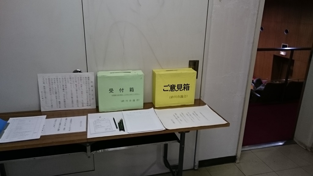 左の写真は本日撮ったものですが、市役所3階の傍聴室の前です。このテーブルで住所氏名を書いて、緑色の受付箱に入れていただければ右側のドアーから傍聴席に座るだけです。