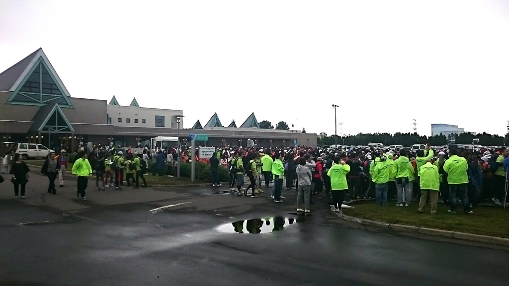 これはいったい?と思っているとすぐに分かりました。赤平市に本社がある空知単板工業㈱が毎年主催している「100kmウォーク」が午前9時にここから出発するところでした。1200人ぐらいが夜中も歩き続けるというハードなものですが、すごい数の人でした。