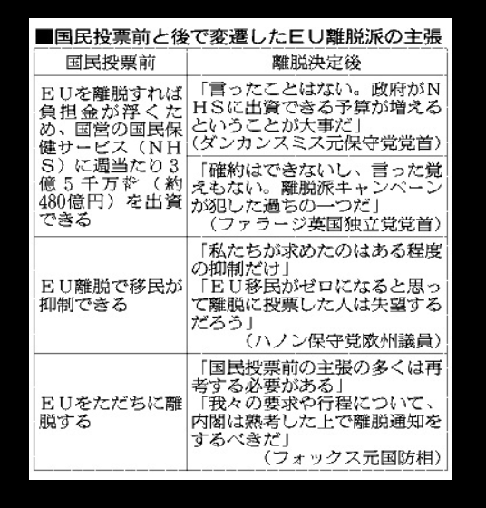 上の写真は国民投票の前後でEU離脱派の主張が違っている内容をまとめたもので、ネットから借用しています。(報道番組でも使っている)
