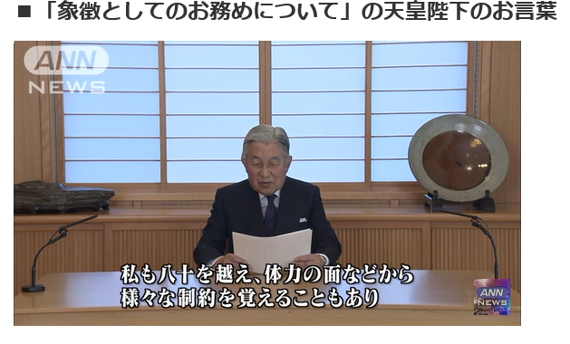 ビデオの中には直接的に生前退位の言葉はありませんが、高齢による体力のこと、戦後70年という節目が過ぎ2年後には天皇即位30年を迎える節目のことなどを通じ、国民の理解を求めています。