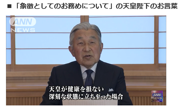 昨日、午後3時から天皇陛下が「象徴としてのお務めについて」というビデオによる言葉が放映されました。私はライブでは見れませんでしたが、ネットで夜に聞きました。「天皇陛下の言葉全文」をリンクします。