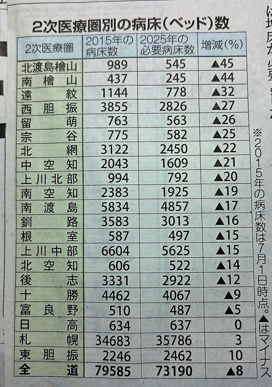 上の写真は記事とともに掲載されていた表ですが、中空知医療圏について21%削減するよう求められていることになります。