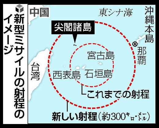 上の写真は次のニュースの図です。「政府は、沖縄県・尖閣諸島などの離島防衛を強化するため、新型の地対艦ミサイルを開発する方針を固めた。