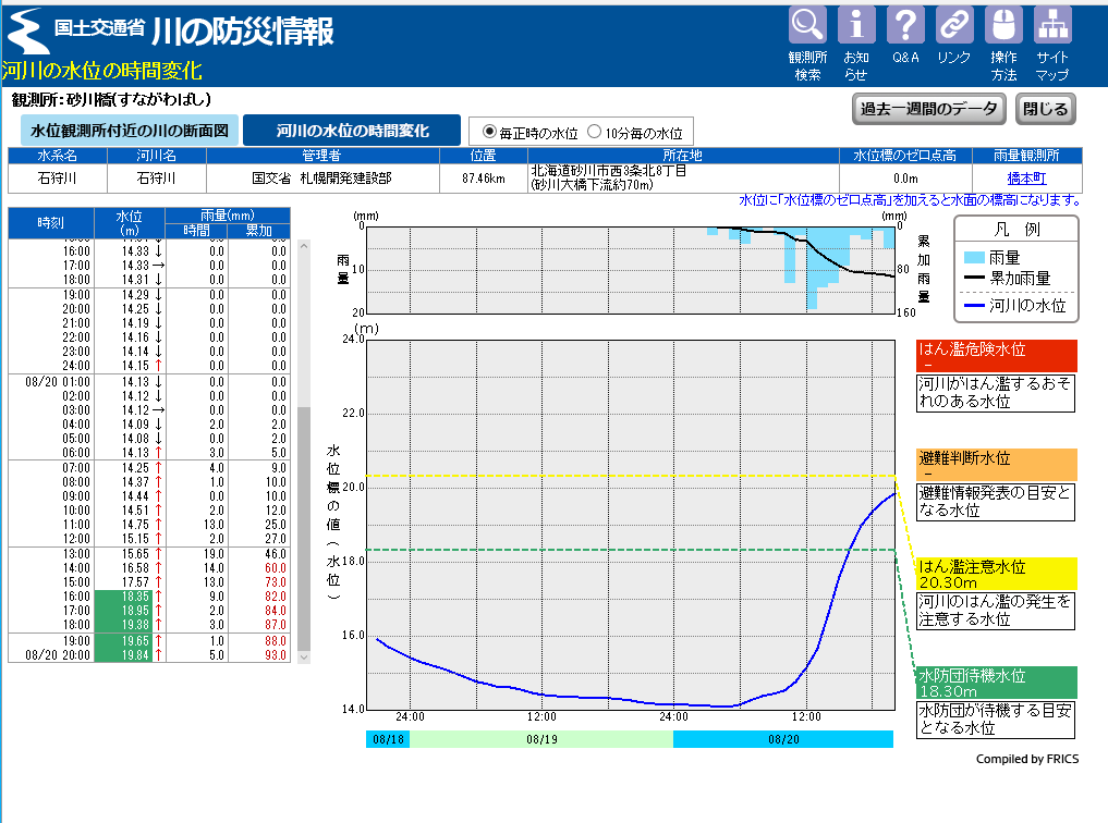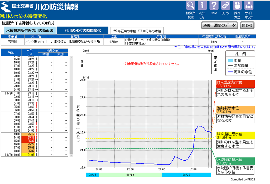 左の写真は中心市街地を流れるパンケ歌志内川の午後2時頃の様子ですが、右の「川の防災情報」午後3時現在で一番下の赤いマークが氾濫危険を告げるパンケ歌志内川の水位を示しています。
