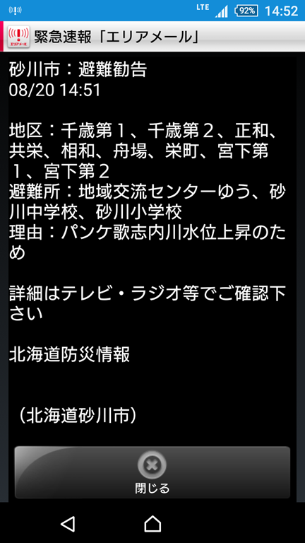 上の2枚は午後2時過ぎ、私の携帯に届いた市内2地域に出された避難勧告のメールです。