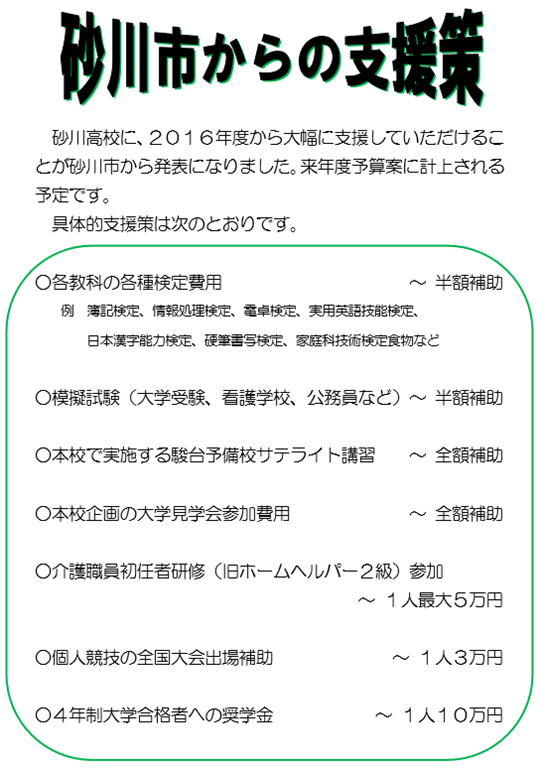 現在の砂川高校への支援策は上の内容になっていますが、今後は・・・