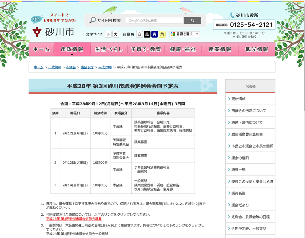 また、今議会で提案された議案については同じく砂川市議会のHP「平成28年 第3回砂川市議会定例会議案」にリンクしますのでご覧ください。