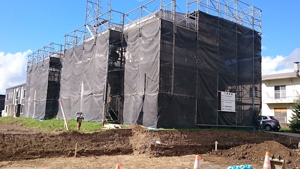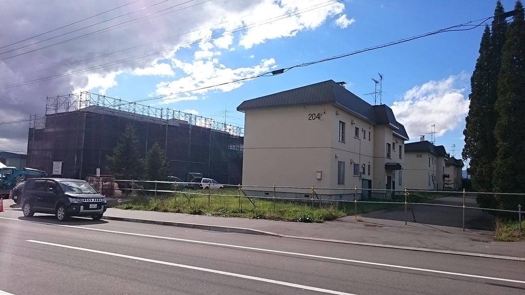 空知太方面を回っていて気になるのは上の写真の改築工事。旧国家公務員住宅の1棟4戸を市が買って、現在、リフォーム中です。この建物の名称は「移住定住促進住宅」といって工期は10月31日まで。