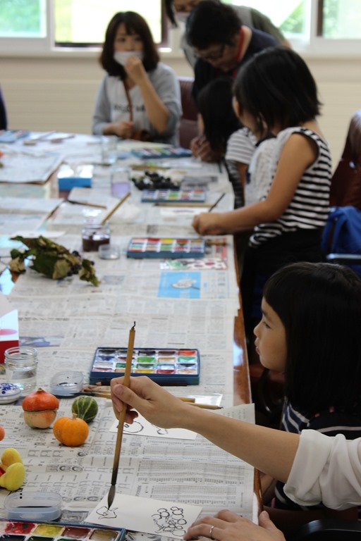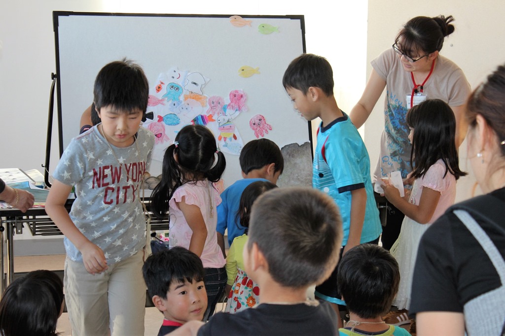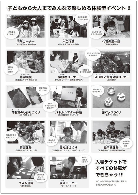 左はスライム作り、真ん中は砂川高校のサンショウオ飼育体験、右は絵手紙コーナーです。