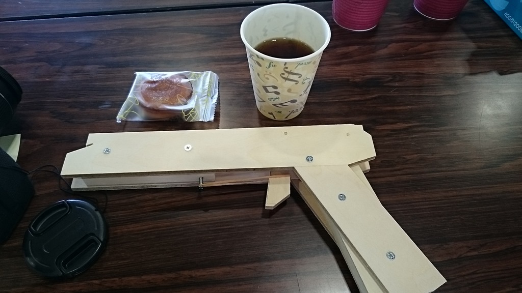 さて、上の写真は私が体験した三共建具㈱提供で連発式の格好いいゴム鉄砲と喫茶コーナーでご馳走になったお菓子と紅茶です。楽しい時間を過ごさせていただきました。