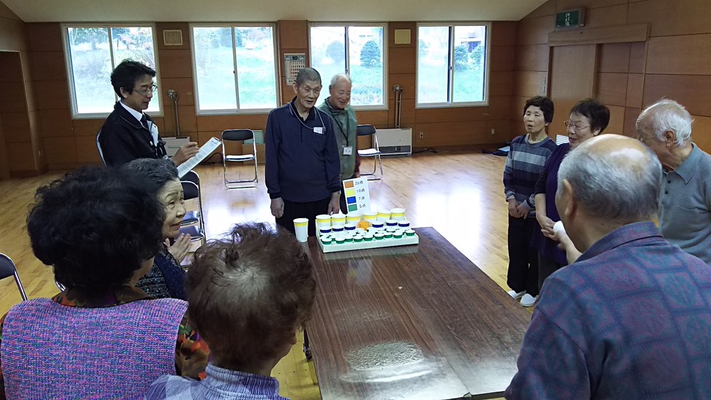 右の写真は2ヵ月に一回、社会福祉協議会の職員によるお楽しみレクの日で、紙コップにピンポン玉を入れて点数を競うゲームをしました。ニコニコ広場らしく、『紙コップを見ると検尿を思い出すよネ~!』で盛り上がる私達でした。来月はお楽しみで、体操の後はお菓子とお抹茶をいただきます。