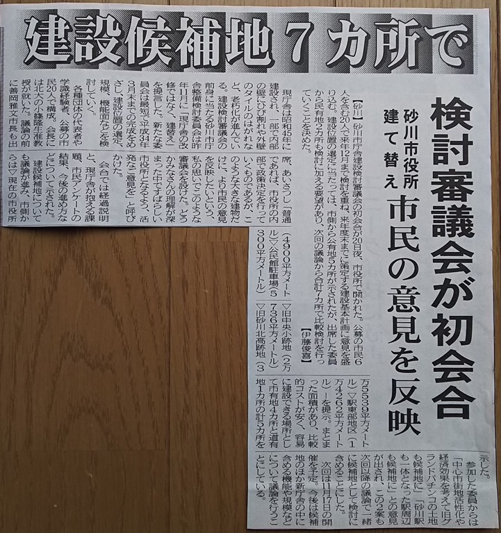 上の写真は本日付けのプレス空知の記事です。砂川市役所の建て替えについて公募委員6人を含む20人による「検討審議会」の初会議が開催されたという内容です。