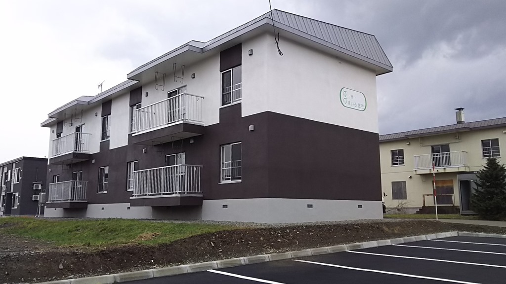 建物にはアパートの名前も掲げられていて「す・き・すまいる住宅」と書かれていました。思い切った名前です。住所は砂川市空知太東2条1丁目・・・・、す・き・すまいる住宅101号とか書くのでしょうか。ちょっと話題になるネーミングですよネ。