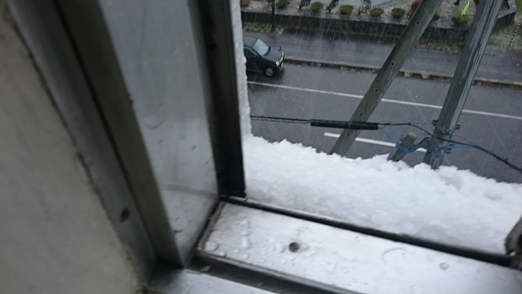 写真は窓枠に積もった雹ですが、慌てて撮ったためピントが車にいって分かりづらいですが、けっこう大粒で積もりました。外の車に被害が出るのではないかと心配したほどです。ほとんどの農作物は収穫後だと思いますが、被害はなかったか心配です。