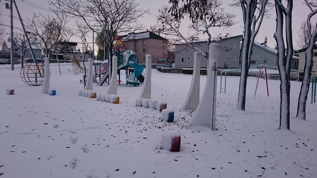 例年より本格的な雪が早いのですが、上の写真は昨日、午前8時から予定されていた町内会清掃の晴見公園です。雪が積もったので、作業は中止にしました。写真を見ると、いつもは雪の降る前に公園の遊具はビニールシートで覆われるのに、昨日段階では間に合っていません。