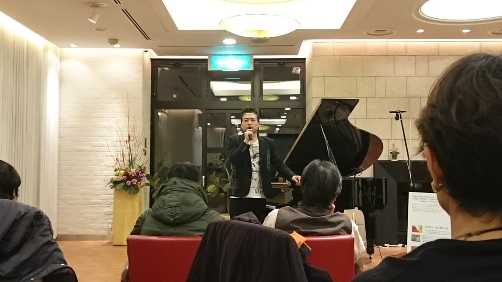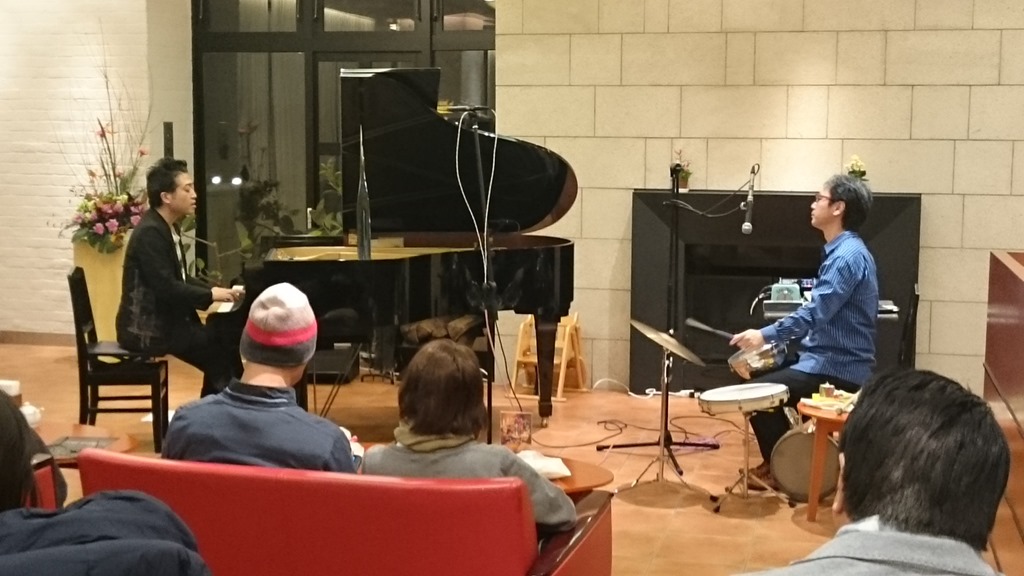 午後5時30分開演のピアノとパーカッションのコンサートが北菓楼本店で開催されました。ジャズピアニストの「野瀬栄進さん」とパーカッションの「武石聡さん」の演奏でしたが、お二人ともアメリカで活躍されているミュージシャンです。