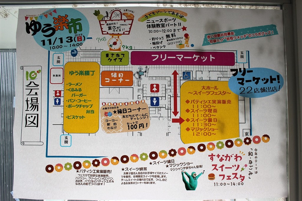 本日、午前10時から地域交流センター「ゆう」で始まった「ゆう楽市」と「すながわ・スイーツ・フェスタ」の会場図です。